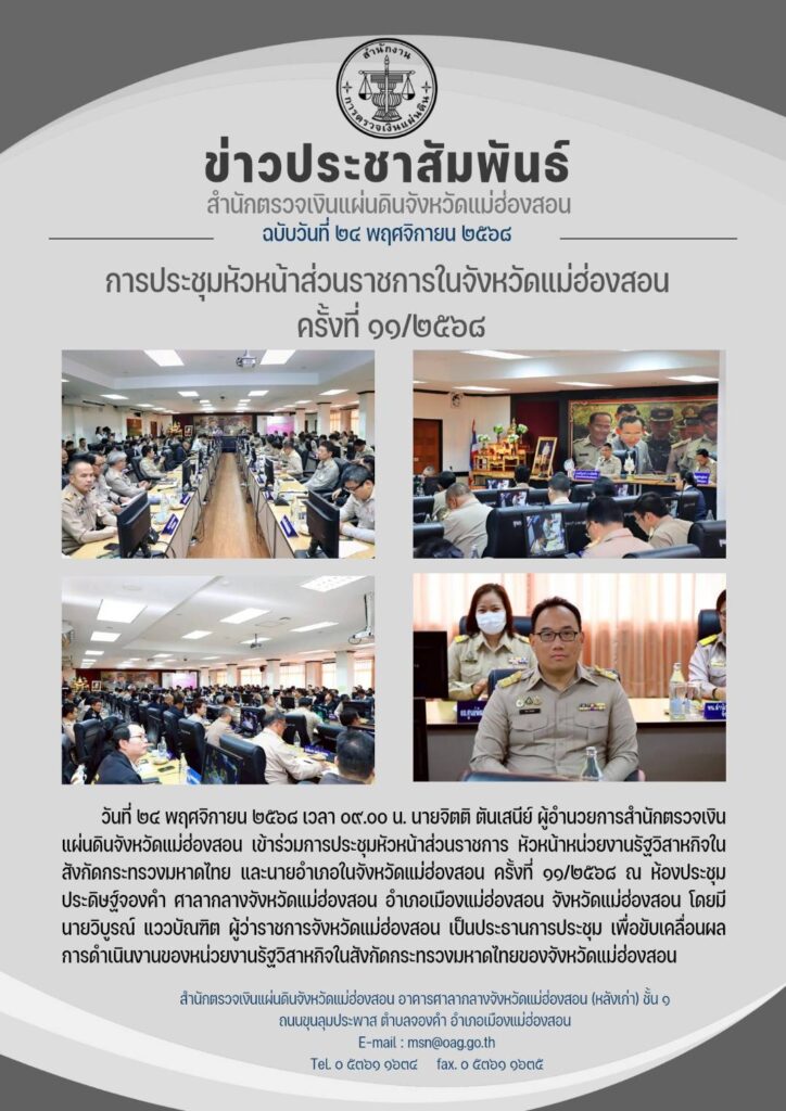 วันที่ ๒๔ พฤศจิกายน ๒๕๖๘ เวลา ๐๙.๐๐ น. นายจิตติ ตันเสนีย์ ผู้อำนวยการสำนักตรวจเงินแผ่นดินจังหวัดแม่ฮ่องสอน เข้าร่วมการประชุมหัวหน้าส่วนราชการ หัวหน้าหน่วยงานรัฐวิสาหกิจในสังกัดกระทรวงมหาดไทย และนายอำเภอในจังหวัดแม่ฮ่องสอน ครั้งที่ ๑๑/๒๕๖๘ ณ ห้องประชุมประดิษฐ์จองคำ ศาลากลางจังหวัดแม่ฮ่องสอน อำเภอเมืองแม่ฮ่องสอน จังหวัดแม่ฮ่องสอน โดยมี นายวิบูรณ์ แววบัณฑิต ผู้ว่าราชการจังหวัดแม่ฮ่องสอน เป็นประธานการประชุม เพื่อขับเคลื่อนผลการดำเนินงานของหน่วยงานรัฐวิสาหกิจในสังกัดกระทรวงมหาดไทยของจังหวัดแม่ฮ่องสอน