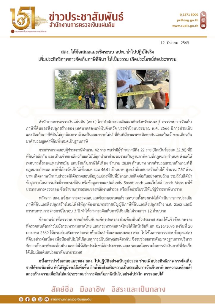 สตง. ให้ข้อเสนอแนะเชิงระบบ อปท. นำไปปฏิบัติจริง เพิ่มประสิทธิภาพการจัดเก็บภาษีที่ดินฯ ให้เป็นธรรม เกิดประโยชน์ต่อประชาชน สำนักงานการตรวจเงินแผ่นดิน (สตง.) โดยสำนักตรวจเงินแผ่นดินจังหวัดนนทบุรี ตรวจพบการจัดเก็บภาษีที่ดินและสิ่งปลูกสร้างของ เทศบาลสองแห่งในจังหวัด ประจำปีงบประมาณ พ.ศ. 2566 มีการประเมิน และจัดเก็บภาษีที่ดินไม่ถูกต้องครบถ้วนเป็นผลมาจากไม่นำที่ดินที่มีอาณาเขตติดต่อกันและเป็นเจ้าของเดียวกันมาคำนวณมูลค่าที่ดินทั้งหมดเป็นฐานภาษีกิจกรรมตรวจสอบ, ข่าวที่น่าสนใจ, ข่าวประชาสัมพันธ์, ภาพกิจกรรมมีนาคม 12, 2026มีนาคม 12, 2026 Post Views: 109