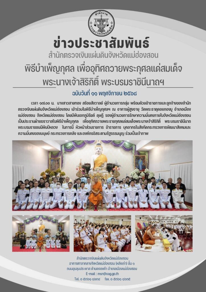 เวลา ๑๗.๐๐ น. นางสาวสายทอง สร้อยสังวาลย์ ผู้อำนวยการกลุ่ม พร้อมด้วยข้าราชการและลูกจ้างของสำนักตรวจเงินแผ่นดินจังหวัดแม่ฮ่องสอน เข้าร่วมในพิธีบำเพ็ญกุศลฯ ณ อาคารผู้สูงอายุ วัดพระธาตุดอยกองมู อำเภอเมือง จังหวัดแม่ฮ่องสอน โดยมีพันเอกภูมิรัชต์ ดุษฎี รองผู้อำนวยการรักษาความมั่นคงภายในจังหวัดแม่ฮ่องสอน เป็นประธานฝ่ายฆราวาสในพิธีบำเพ็ญกุศล เพื่ออุทิศถวายพระราชกุศลแด่สมเด็จพระนางเจ้าสิริกิติ์ พระบรมราชินีนาถ พระบรมราชชนนีพันปีหลวง ในการนี้ หัวหน้าส่วนราชการข้าราชการ บุคลากรในสังกัดกระทรวงการพัฒนาสังคมและความมั่นคงของมนุษย์ กระทรวงการคลัง และองค์กรอิสระตามรัฐธรรมนูญ ร่วมเป็นเจ้าภาพ