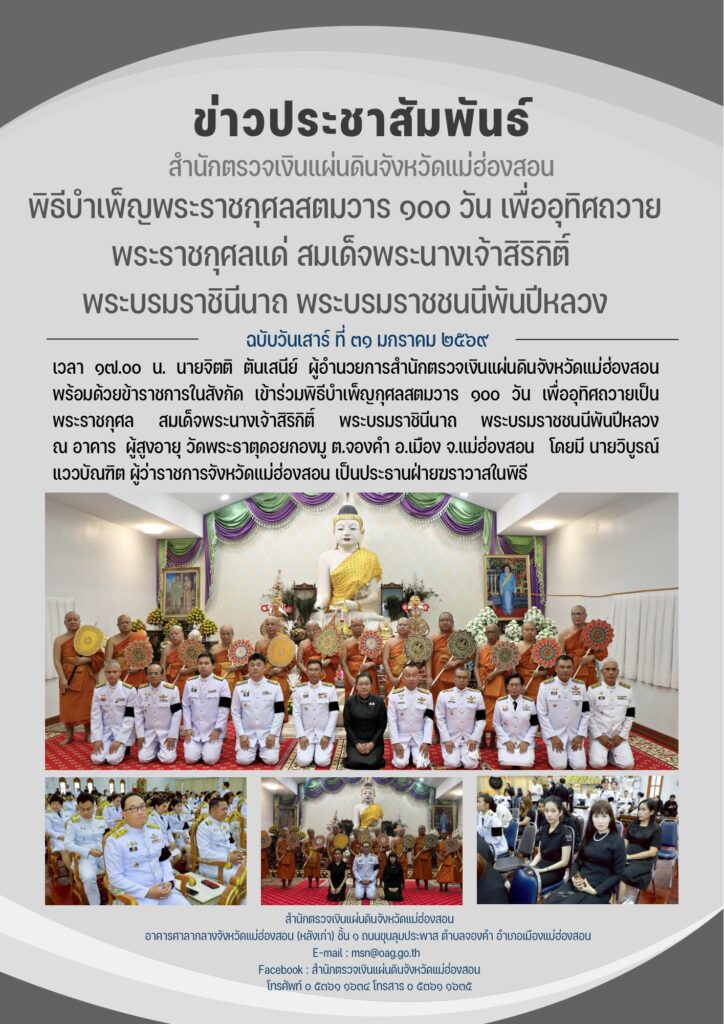 เมื่อวันเสาร์ที่ ๓๑ มกราคม ๒๕๖๙ เวลา ๑๗.๐๐ น. นายจิตติ ตันเสนีย์ ผู้อำนวยการสำนักตรวจเงินแผ่นดินจังหวัดแม่ฮ่องสอน พร้อมด้วยข้าราชการในสังกัด เข้าร่วมพิธีบำเพ็ญกุศลสตมวาร ๑๐๐ วัน เพื่ออุทิศถวายเป็น พระราชกุศล สมเด็จพระนางเจ้าสิริกิติ์ พระบรมราชินีนาถ พระบรมราชชนนีพันปีหลวง ณ อาคาร ผู้สูงอายุ วัดพระธาตุดอยกองมู ต.จองคำ อ.เมือง จ.แม่ฮ่องสอน โดยมี นายวิบูรณ์ แววบัณฑิต ผู้ว่าราชการจังหวัดแม่ฮ่องสอน เป็นประธานฝ่ายฆราวาสในพิธีงานราชพิธี/รัฐพิธี, ภาพกิจกรรมกุมภาพันธ์ 1, 2026กุมภาพันธ์ 1, 2026 Post Views: 128